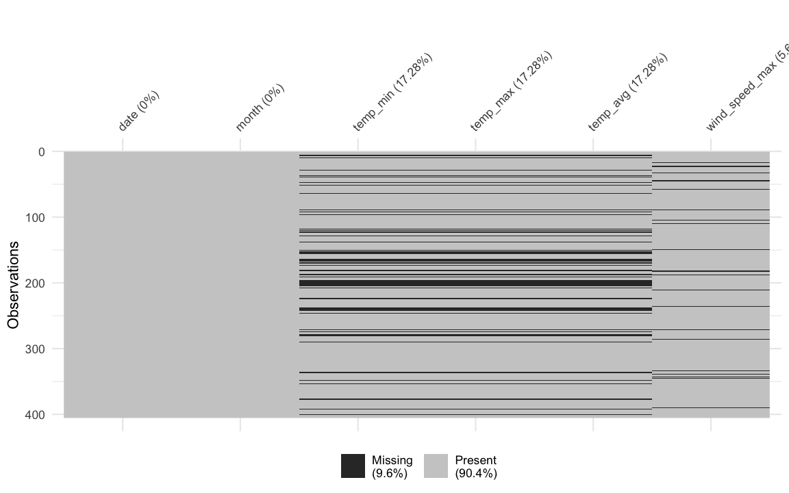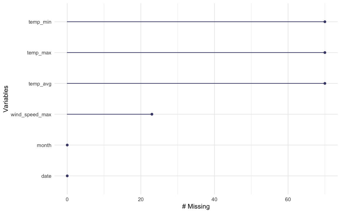 miss_var_summary(dat_sf_clean)## # A tibble: 6 x 3## variable n_miss pct_miss## <chr> <int> <dbl>## 1 temp_min 70 17.3 ## 2 temp_max 70 17.3 ## 3 temp_avg 70 17.3 ## 4 wind_speed_max 23 5.68## 5 date 0 0 ## 6 month 0 0Use miss_var_summary to summarise the number of missings in each variable.