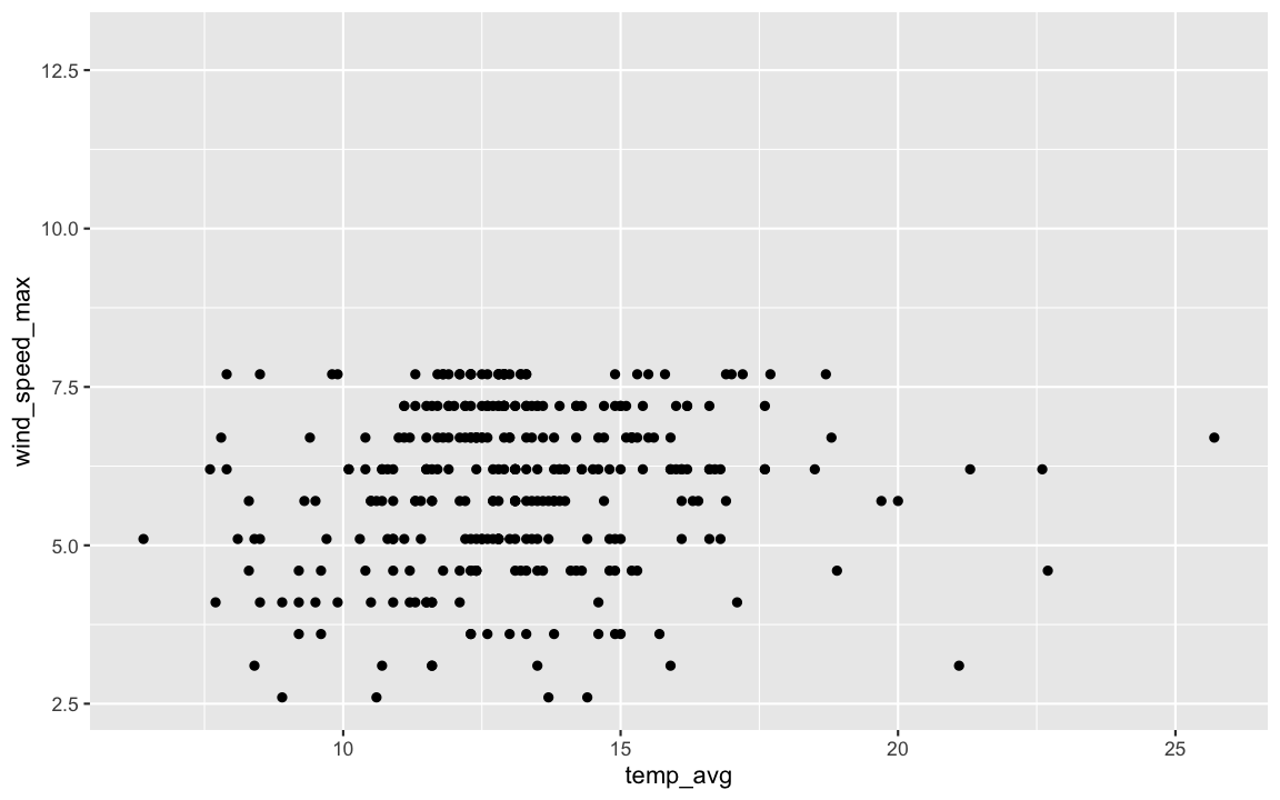 ggplot(dat_sf_clean, aes(x = temp_avg, y = wind_speed_max)) + geom_point()