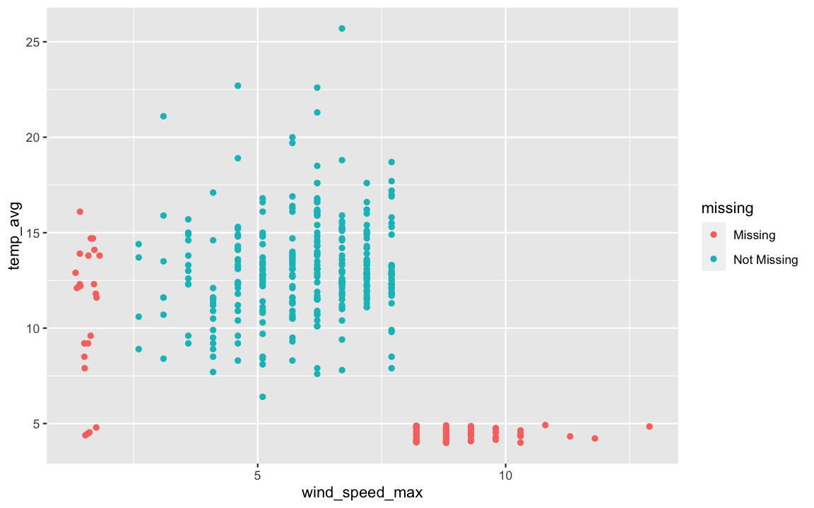 ## # A tibble: 7 x 2## temp_avg temp_avg_NA## <dbl> <fct> ## 1 8.4 !NA ## 2 9.7 !NA ## 3 12.4 !NA ## 4 8.1 !NA ## 5 6.4 !NA ## 6 NA NA ## 7 NA NA## # A tibble: 7 x 2## temp_avg temp_avg_NA## <dbl> <fct> ## 1 8.4 !NA ## 2 9.7 !NA ## 3 12.4 !NA ## 4 8.1 !NA ## 5 6.4 !NA ## 6 NA NA ## 7 NA NA## # A tibble: 7 x 2## temp_avg temp_avg_NA## <dbl> <fct> ## 1 8.4 !NA ## 2 9.7 !NA ## 3 12.4 !NA ## 4 8.1 !NA ## 5 6.4 !NA ## 6 5.66 NA ## 7 5.69 NAOne approach, (ggobi) is to shift missing values below the minimum value
