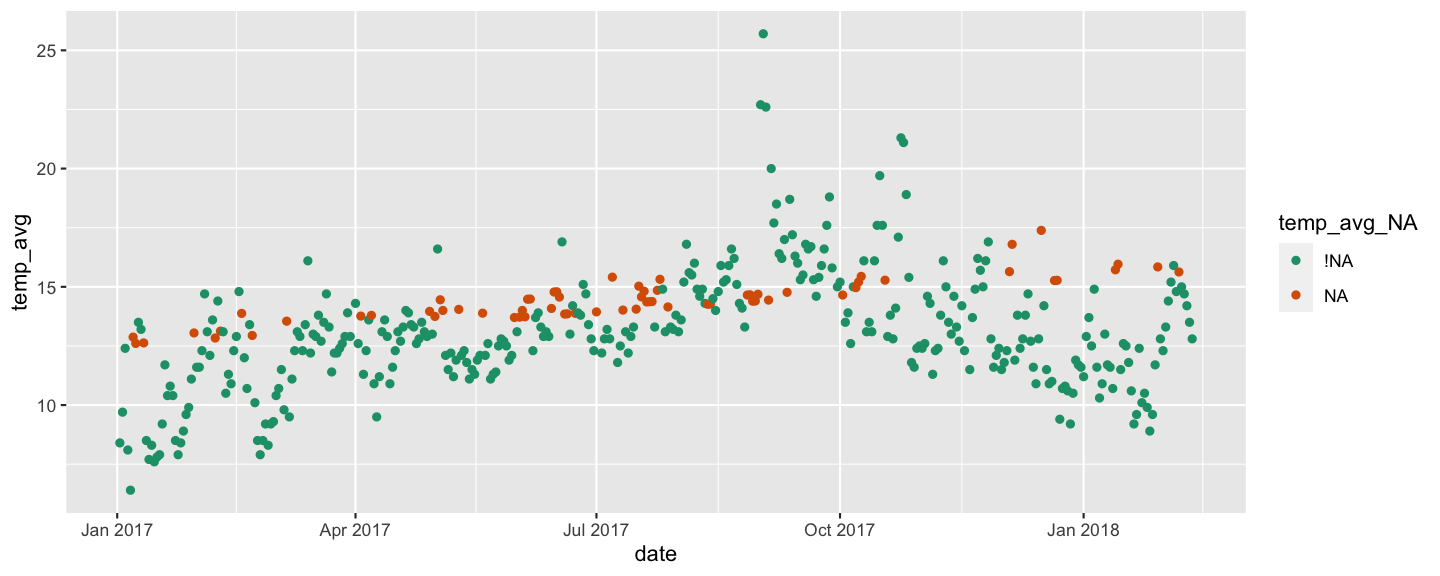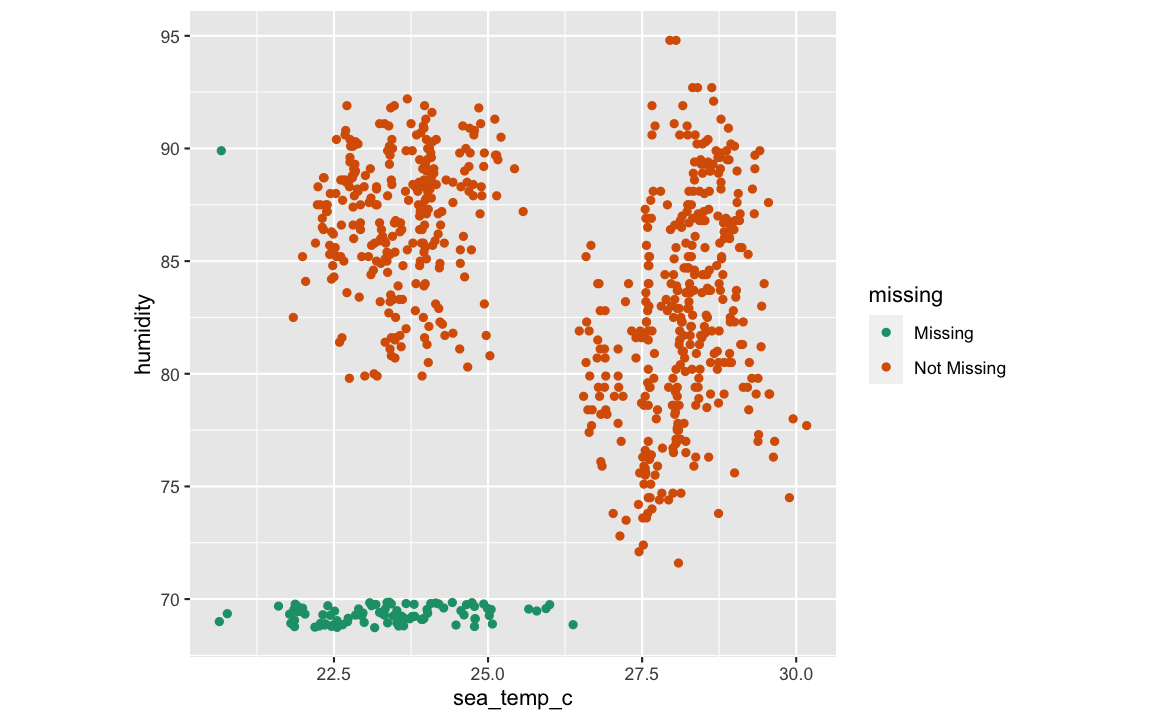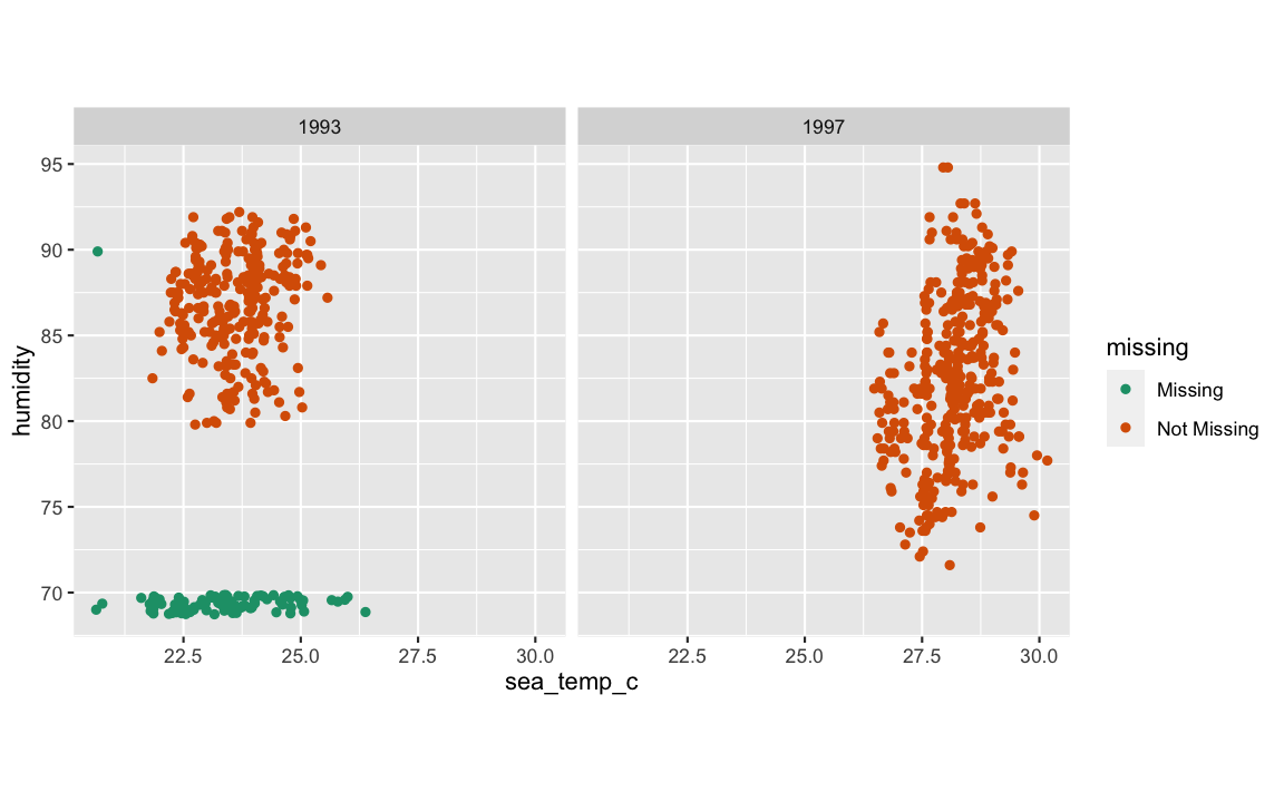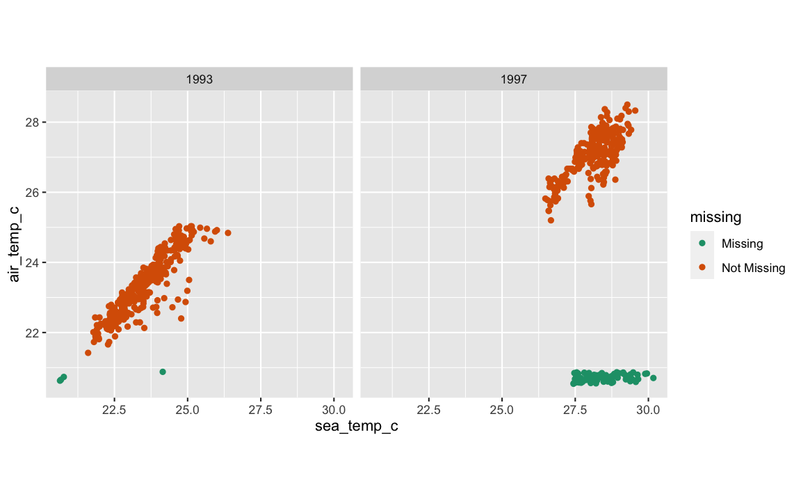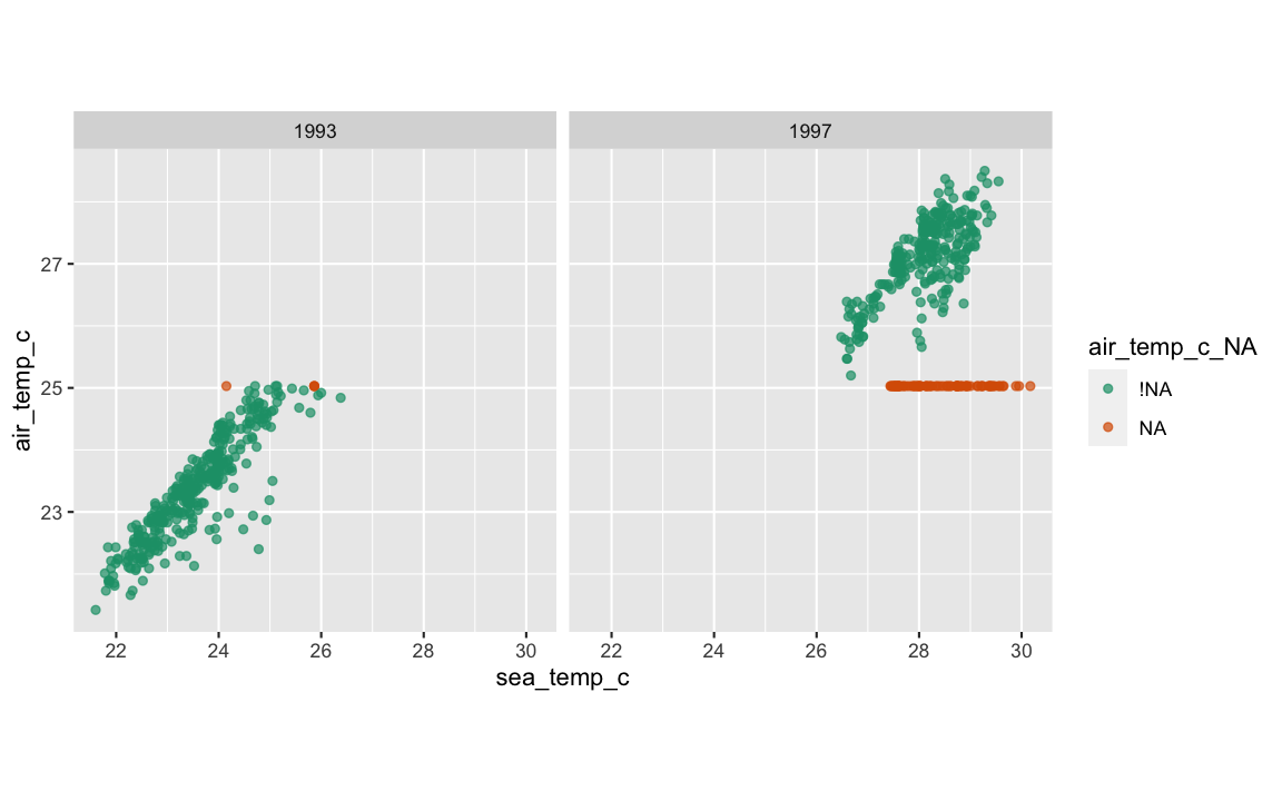 tao_shadow <- bind_shadow(oceanbuoys)tao_shadow## # A tibble: 736 x 16## year latitude longitude sea_temp_c air_temp_c humidity wind_ew wind_ns year_NA latitude_NA## <dbl> <dbl> <dbl> <dbl> <dbl> <dbl> <dbl> <dbl> <fct> <fct> ## 1 1997 0 -110 27.6 27.1 79.6 -6.40 5.40 !NA !NA ## 2 1997 0 -110 27.5 27.0 75.8 -5.30 5.30 !NA !NA ## 3 1997 0 -110 27.6 27 76.5 -5.10 4.5 !NA !NA ## 4 1997 0 -110 27.6 26.9 76.2 -4.90 2.5 !NA !NA ## 5 1997 0 -110 27.6 26.8 76.4 -3.5 4.10 !NA !NA ## 6 1997 0 -110 27.8 26.9 76.7 -4.40 1.60 !NA !NA ## 7 1997 0 -110 28.0 27.0 76.5 -2 3.5 !NA !NA ## 8 1997 0 -110 28.0 27.1 78.3 -3.70 4.5 !NA !NA ## 9 1997 0 -110 28.0 27.2 78.6 -4.20 5 !NA !NA ## 10 1997 0 -110 28.0 27.2 76.9 -3.60 3.5 !NA !NA ## # … with 726 more rows, and 6 more variables: longitude_NA <fct>, sea_temp_c_NA <fct>,## # air_temp_c_NA <fct>, humidity_NA <fct>, wind_ew_NA <fct>, wind_ns_NA <fct>tao_imp_mean <- tao_shadow %>% mutate(sea_temp_c = impute_mean(sea_temp_c), air_temp_c = impute_mean(air_temp_c))tao_shadow## # A tibble: 736 x 16## year latitude longitude sea_temp_c air_temp_c humidity wind_ew wind_ns year_NA latitude_NA## <dbl> <dbl> <dbl> <dbl> <dbl> <dbl> <dbl> <dbl> <fct> <fct> ## 1 1997 0 -110 27.6 27.1 79.6 -6.40 5.40 !NA !NA ## 2 1997 0 -110 27.5 27.0 75.8 -5.30 5.30 !NA !NA ## 3 1997 0 -110 27.6 27 76.5 -5.10 4.5 !NA !NA ## 4 1997 0 -110 27.6 26.9 76.2 -4.90 2.5 !NA !NA ## 5 1997 0 -110 27.6 26.8 76.4 -3.5 4.10 !NA !NA ## 6 1997 0 -110 27.8 26.9 76.7 -4.40 1.60 !NA !NA ## 7 1997 0 -110 28.0 27.0 76.5 -2 3.5 !NA !NA ## 8 1997 0 -110 28.0 27.1 78.3 -3.70 4.5 !NA !NA ## 9 1997 0 -110 28.0 27.2 78.6 -4.20 5 !NA !NA ## 10 1997 0 -110 28.0 27.2 76.9 -3.60 3.5 !NA !NA ## # … with 726 more rows, and 6 more variables: longitude_NA <fct>, sea_temp_c_NA <fct>,## # air_temp_c_NA <fct>, humidity_NA <fct>, wind_ew_NA <fct>, wind_ns_NA <fct>ggplot(tao_imp_mean, aes(x = sea_temp_c, y = air_temp_c, colour = air_temp_c_NA)) + geom_point(alpha = 0.7) + facet_wrap(~year) + scale_colour_brewer(palette = "Dark2") + theme(aspect.ratio = 1)