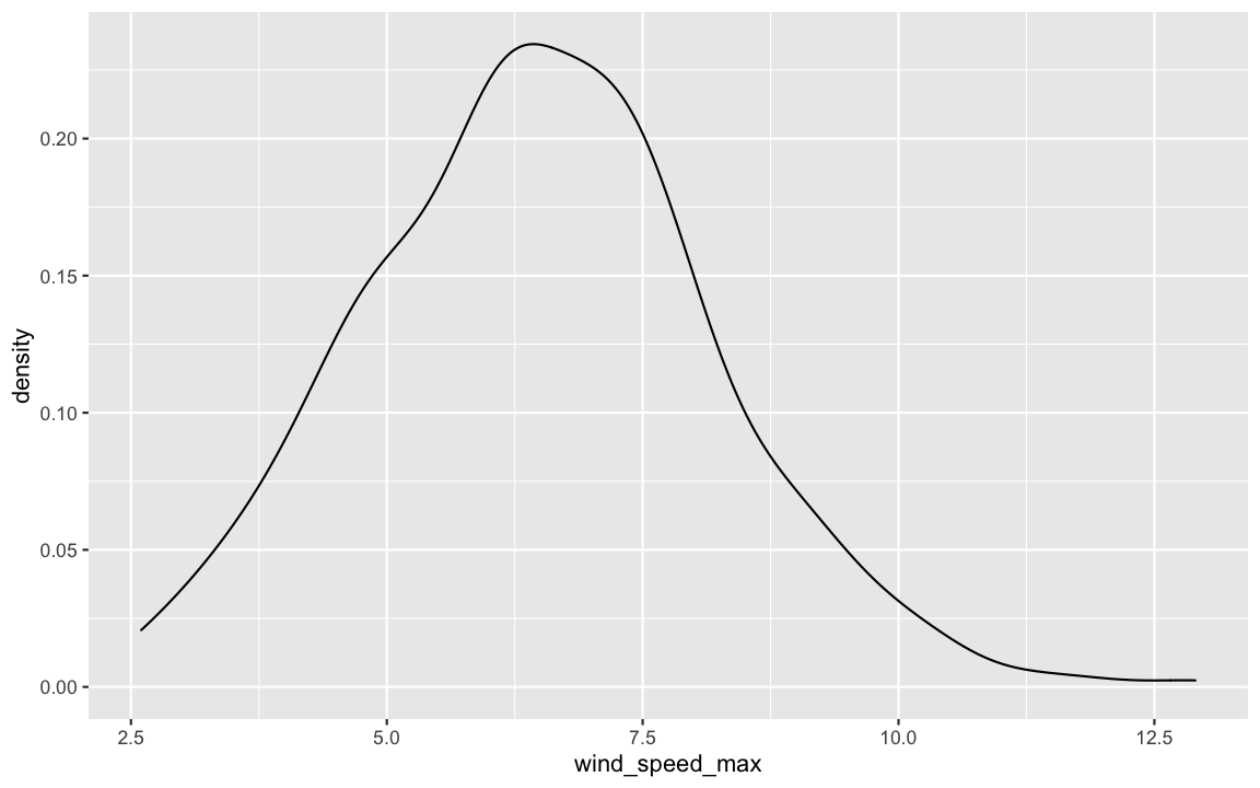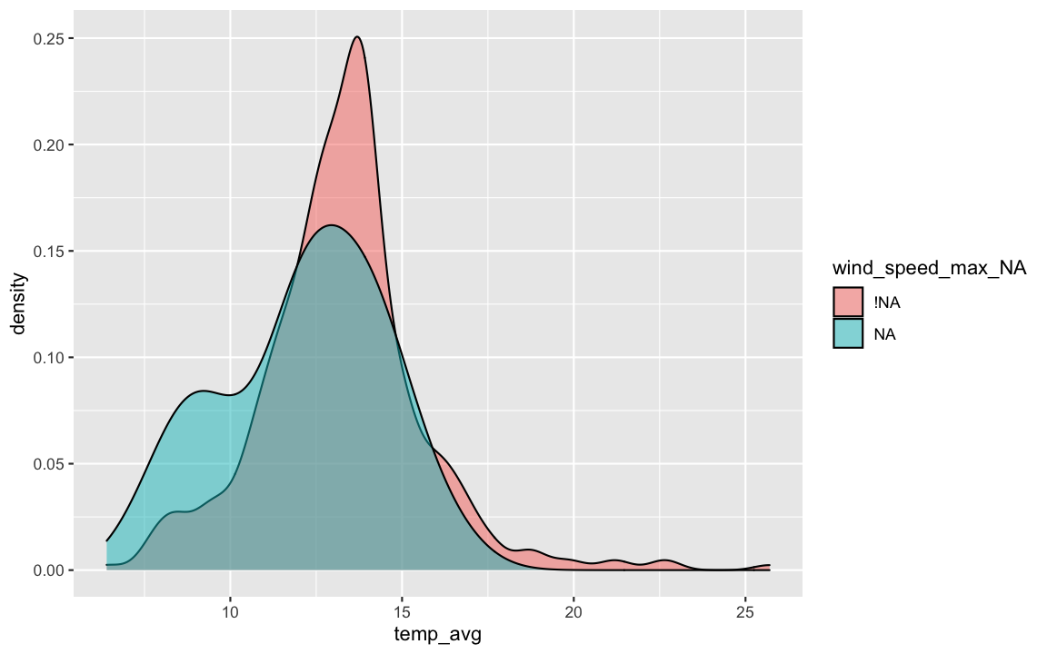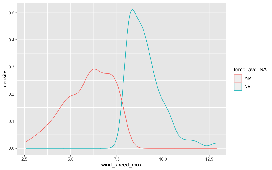 bind_shadow()bind_shadow(dat_sf_clean) %>% glimpse()## Rows: 405## Columns: 12## $ date <date> 2017-01-02, 2017-01-03, 2017-01-04, 2017-01-05, 2017-01-06, 2017-0…## $ month <dbl> 1, 1, 1, 1, 1, 1, 1, 1, 1, 1, 1, 1, 1, 1, 1, 1, 1, 1, 1, 1, 1, 1, 1…## $ temp_min <dbl> 5.9, 8.4, 10.4, 5.8, 4.4, NA, NA, 11.9, 11.9, NA, 6.7, 5.5, 6.2, 5.…## $ temp_max <dbl> 10.5, 11.1, 14.5, 9.4, 9.1, NA, NA, 16.0, 14.6, NA, 11.2, 11.7, 11.…## $ temp_avg <dbl> 8.4, 9.7, 12.4, 8.1, 6.4, NA, NA, 13.5, 13.2, NA, 8.5, 7.7, 8.3, 7.…## $ wind_speed_max <dbl> 5.1, 5.1, 6.7, 5.1, 5.1, 8.8, 8.2, 7.2, 7.7, 8.2, 5.1, 4.1, 4.6, 6.…## $ date_NA <fct> !NA, !NA, !NA, !NA, !NA, !NA, !NA, !NA, !NA, !NA, !NA, !NA, !NA, !N…## $ month_NA <fct> !NA, !NA, !NA, !NA, !NA, !NA, !NA, !NA, !NA, !NA, !NA, !NA, !NA, !N…## $ temp_min_NA <fct> !NA, !NA, !NA, !NA, !NA, NA, NA, !NA, !NA, NA, !NA, !NA, !NA, !NA, …## $ temp_max_NA <fct> !NA, !NA, !NA, !NA, !NA, NA, NA, !NA, !NA, NA, !NA, !NA, !NA, !NA, …## $ temp_avg_NA <fct> !NA, !NA, !NA, !NA, !NA, NA, NA, !NA, !NA, NA, !NA, !NA, !NA, !NA, …## $ wind_speed_max_NA <fct> !NA, !NA, !NA, !NA, !NA, !NA, !NA, !NA, !NA, !NA, !NA, !NA, !NA, !N…dat_sf_clean %>% ggplot(aes(x = wind_speed_max)) + geom_density()