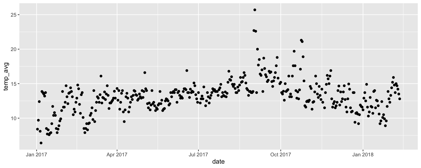 dat_sf_clean %>% as.data.frame() %>% simputation::impute_lm(temp_avg ~ wind_speed_max) %>% ggplot(aes(x = date, y = temp_avg)) + geom_point()