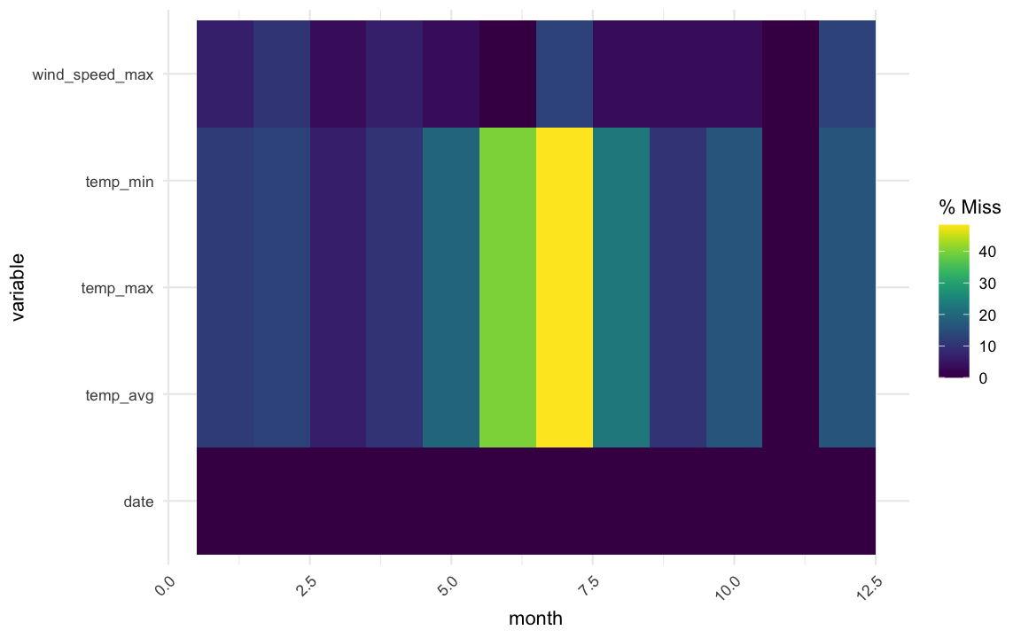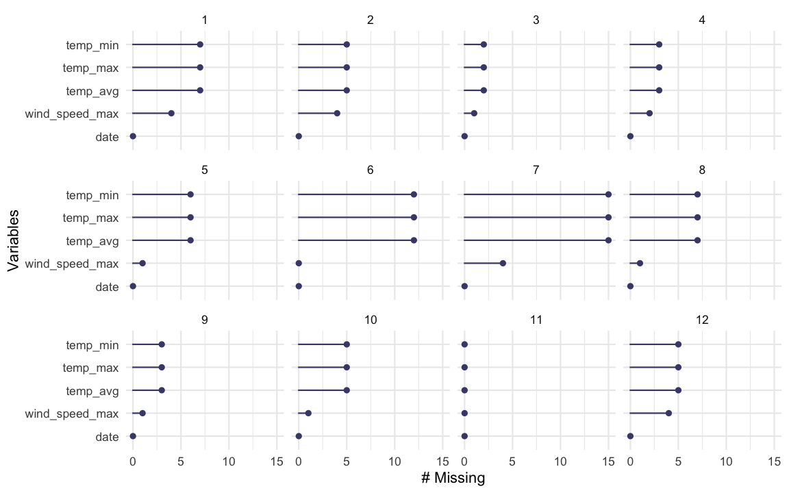group_bydat_sf_clean %>% group_by(month) %>% miss_var_summary()## # A tibble: 60 x 4## # Groups: month [12]## month variable n_miss pct_miss## <dbl> <chr> <int> <dbl>## 1 1 temp_min 7 11.5 ## 2 1 temp_max 7 11.5 ## 3 1 temp_avg 7 11.5 ## 4 1 wind_speed_max 4 6.56## 5 1 date 0 0 ## 6 2 temp_min 5 12.8 ## 7 2 temp_max 5 12.8 ## 8 2 temp_avg 5 12.8 ## 9 2 wind_speed_max 4 10.3 ## 10 2 date 0 0 ## # … with 50 more rowsSometimes you are interested in missingness for groups in the data.