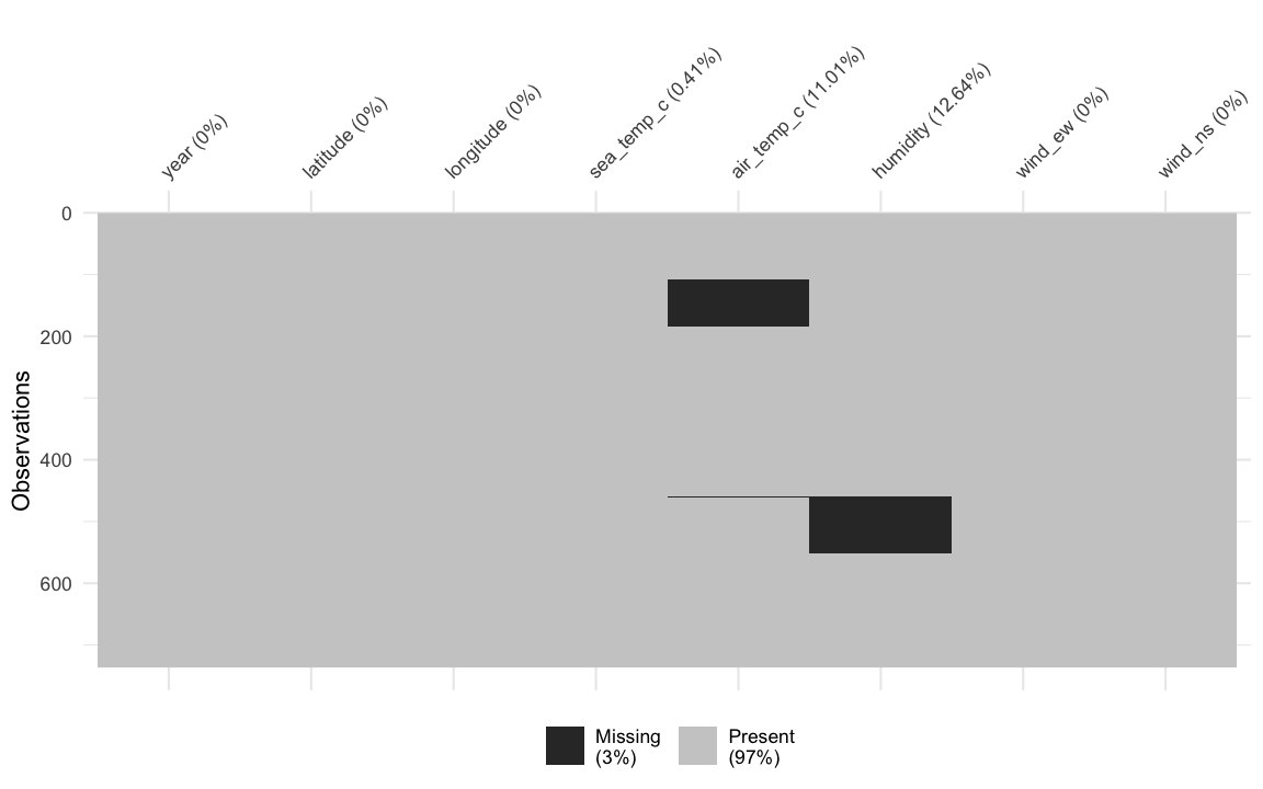 oceanbuoys## # A tibble: 736 x 8## year latitude longitude sea_temp_c air_temp_c humidity wind_ew wind_ns## <dbl> <dbl> <dbl> <dbl> <dbl> <dbl> <dbl> <dbl>## 1 1997 0 -110 27.6 27.1 79.6 -6.40 5.40## 2 1997 0 -110 27.5 27.0 75.8 -5.30 5.30## 3 1997 0 -110 27.6 27 76.5 -5.10 4.5 ## 4 1997 0 -110 27.6 26.9 76.2 -4.90 2.5 ## 5 1997 0 -110 27.6 26.8 76.4 -3.5 4.10## 6 1997 0 -110 27.8 26.9 76.7 -4.40 1.60## 7 1997 0 -110 28.0 27.0 76.5 -2 3.5 ## 8 1997 0 -110 28.0 27.1 78.3 -3.70 4.5 ## 9 1997 0 -110 28.0 27.2 78.6 -4.20 5 ## 10 1997 0 -110 28.0 27.2 76.9 -3.60 3.5 ## # … with 726 more rowsvis_miss(oceanbuoys)